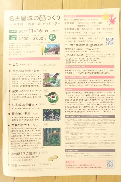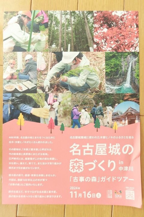 中区の名古屋城主催のイベントです。中区の愛知県自治センターにて集合、貸し切りバスにて中津川エリアを巡り、再度中区の愛知県自治センターに戻るツアーです。参加者対象は小学生以上、抽選39名。9/23(月)募集締め切り。名古屋城に使われた木曽ヒノキのふるさとを巡るツアーで、100年以上の木が育つ森をご案内いたします。参加費は4,000円から8,000円です。スケジュールには市民の森植樹や山神社見学などが含まれます。