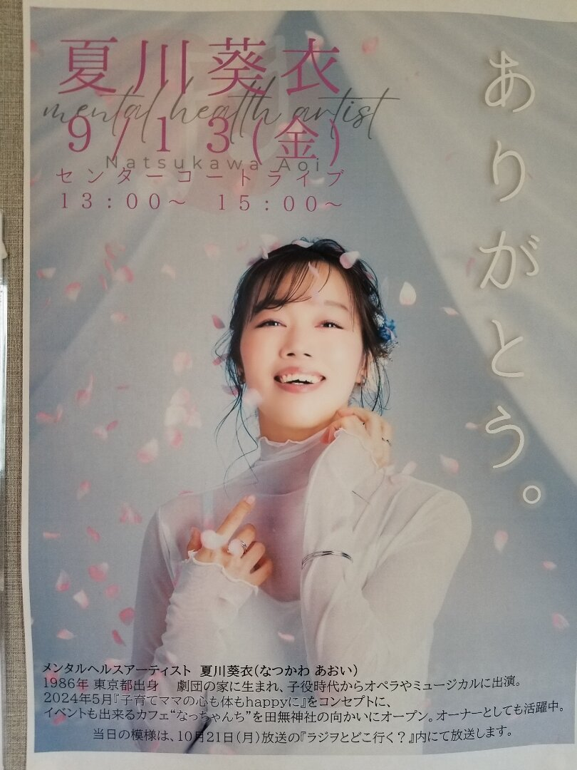 田無神社前のカフェ「なっちゃんち」のオーナーとしても活躍される、夏川葵衣さんのライブがアスタ2階センターコートで行われるそうです💕