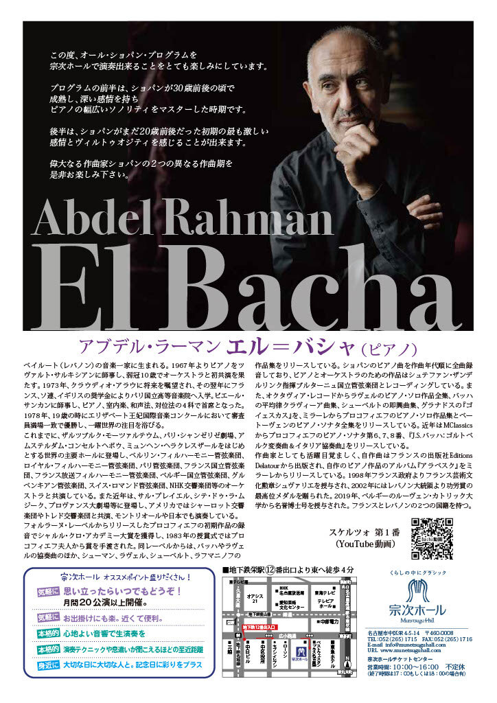 アブデル・ラーマン・エル=バシャによる待望のピアノ・リサイタル。前半ではショパン30歳前後の成熟期を象徴するマズルカやポロネーズ、ノクターンを、後半では20歳前後の初期作品、激しい情熱と技巧を駆使したスケルツォや12の練習曲で聴衆を魅了します。異なる作曲期の対比が際立つオール・ショパン・プログラムをお楽しみください。世界的ピアニストが紡ぐ美音を心ゆくまでご堪能ください。