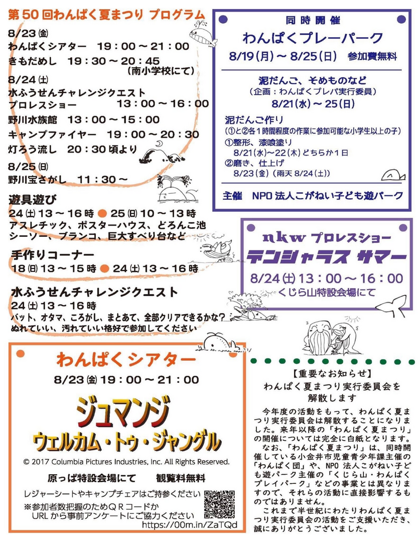 今年度の活動をもって、わんぱく夏まつり実行委員会は解散することになりました。来年以降の「わんぱく夏まつり」の開催については完全に白紙となります。これまで半世紀にわたりわんぱく夏まつり実行委員会の活動をご支援いただき、誠にありがとうございました。