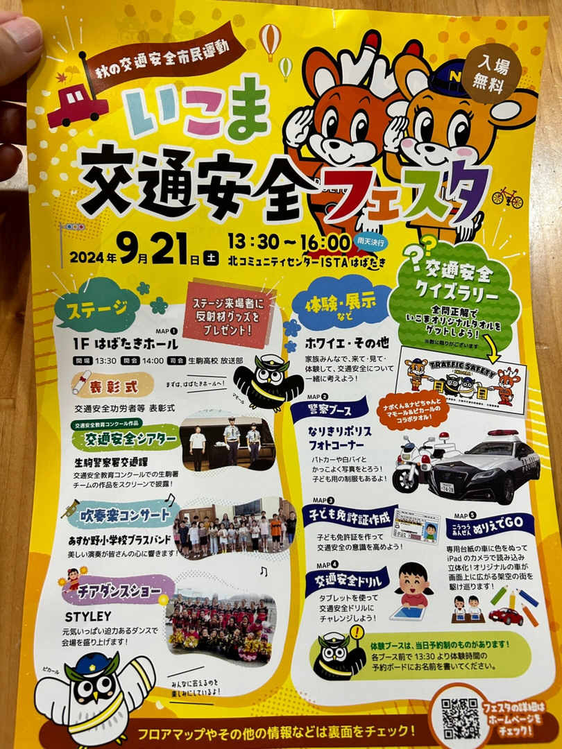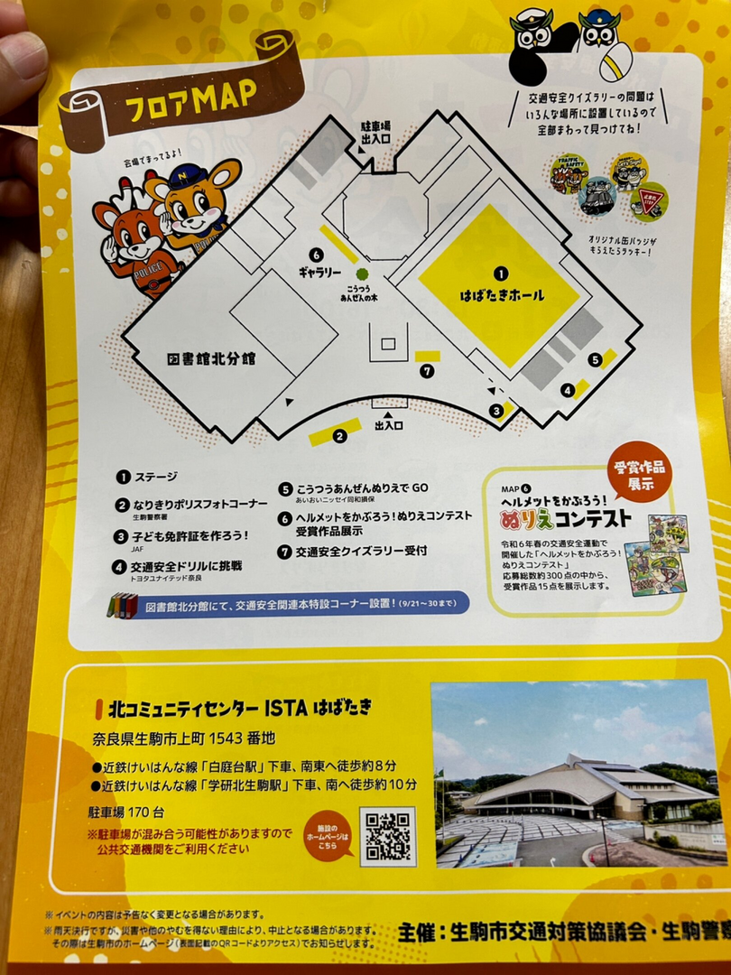 保育園で配られていたチラシです🚓 楽しそうなステージやなりきりポリスフォトコーナーやこども免許証が作れるコーナーも。いいなー、行きたい‼️ 残念ながら仕事なので連れて行ってあげられない😭 入場無料✨ 9/21(日) 13:30~16:00 北コミュニティセンターISTAはばたきで開催です🎵 秋の交通安全市民運動 いこま 入場 無料 交通安全フェスタ 2024921 13:30~16:00 雨天決行 北コミュニティセンター ISTA はばたき 交通安全 クイズラリー 全問正解で 日 ステージ MAPO ステージ来場者に 反射材グッズを プレゼント! 体験・展示 など いこまオリジナルタオルを ゲットしよう! ホワイエ・その他 数に限りがございます 1F はばたきホール TRAFFIC SAFETY 開場 13:30 開会 14:00 司会 生駒高校放送部 表彰式 まずは、はばたきホールへ! 交通安全功労者等表彰式 コンクール作品 交通安全シアター 家族みんなで、 来て・見て・ 体験して、交通安全について 一緒に考えよう! MAP 2 警察ブース ナボくん&ナビちゃんと マモール&ピカールの コラボタオル! なりきりポリス 生駒警察署交通理 交通安全教育コンクールでの生駒署 チームの作品をスクリーンで披露! 吹奏楽コンサート あすか野小学校ブラスバンド 美しい演奏が皆さんの心に響きます 「チアダンスショー STYLEY 元気いっぱい迫力あるダンスで 会場を盛り上げます! フォトコーナー パトカーや白バイと かっこよく写真をとろう! 子ども用の制服もあるよ! MAPO 子ども免許証作成 子ども免許証を作って 交通安全の意識を高めよう! MAPO 交通安全ドリル タブレットを使って 交通安全ドリルに チャレンジしよう! MAP 5 ぬりえで GO POLICE 専用台紙の車に色をぬって iPad のカメラで読み込み 立体化!オリジナルの車が 画面上に広がる架空の街を 駆け巡ります! ピカール 198 みんなに言えるのを 楽しみにしているよ! 体験ブースは、当日予約制のものがあります! 各ブース前で 13:30 より体験時間の 予約ボードにお名前を書いてください。 フロアマップやその他の情報などは裏面をチェック! フェスタの詳細は ホームページを チェック!フロアMAP 会場でまってるよ! POLICE 図書館北分館 ° 駐車場 出入口 交通安全クイズラリーの問題は いろんな場所に設置しているので 全部まわって見つけてね! ギャラリー 0 こうつう あんぜんの木 はばたきホール 出入口 2 止まれ オリジナル缶バッジザ もらえたらラッキー! コンテスト 展示 ステージ 受賞作品 ② なりきりポリスフォトコーナー 生物警察署 ⑤5 こうつうあんぜんぬりえでGO あいおいニッセイ同和損保 MAP 6 ヘルメットをかぶろう! ③ 子ども免許証を作ろう! ⑥ ヘルメットをかぶろう! ぬりえコンテスト 受賞作品展示 JAF ⑦ 交通安全クイズラリー受付 |交通安全ドリルに挑戦 トヨタユナイテッド奈良 図書館北分館にて、交通安全関連本特設コーナー設置! (9/21~30まで) 令和6年春の交通安全運動で 開催した 「ヘルメットをかぶろう! ぬりえコンテスト」 応募総数約300点の中から、 受賞作品15点を展示します。 北コミュニティセンター ISTA はばたき 奈良県生駒市上町1543番地 ●近鉄けいはんな線 「白庭台駅」 下車、南東へ徒歩約8分 ●近鉄けいはんな線 「学研北生駒駅」下車、南へ徒歩約10分 駐車場 170 台 施設の ※駐車場が混み合う可能性がありますのでホームページは 公共交通機関をご利用ください こちら ※イベントの内容は予告なく変更となる場合があります。 ※天決行ですが、災害や他のやむを得ない理由により、中止となる場合があります。 主催: 生駒市交通対策協議会・生駒警察 その際は生駒市のホームページ(表面記載のQRコードよりアクセス)でお知らせします。