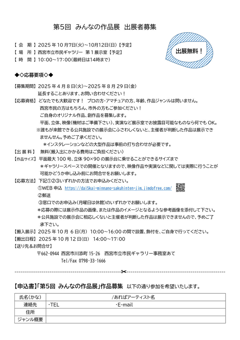西宮市立市民ギャラリーにて、西宮市民のみなさんを中心に(市外のみなさんも大歓迎!)プロ・アマ・年齢を問わず、作品のジャンルを問わず展覧会を開催します。現在、出展作品を募集しています。出展料は無料ですので、ぜひお気軽にご参加ください♪一緒に楽しい展覧会にしましょう^^ご参加お待ちしております!