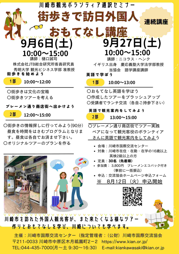 川崎市を訪れた外国人観光客が、また来たくなる様なツアー作りとおもてなしを学び、川崎についても学べます。