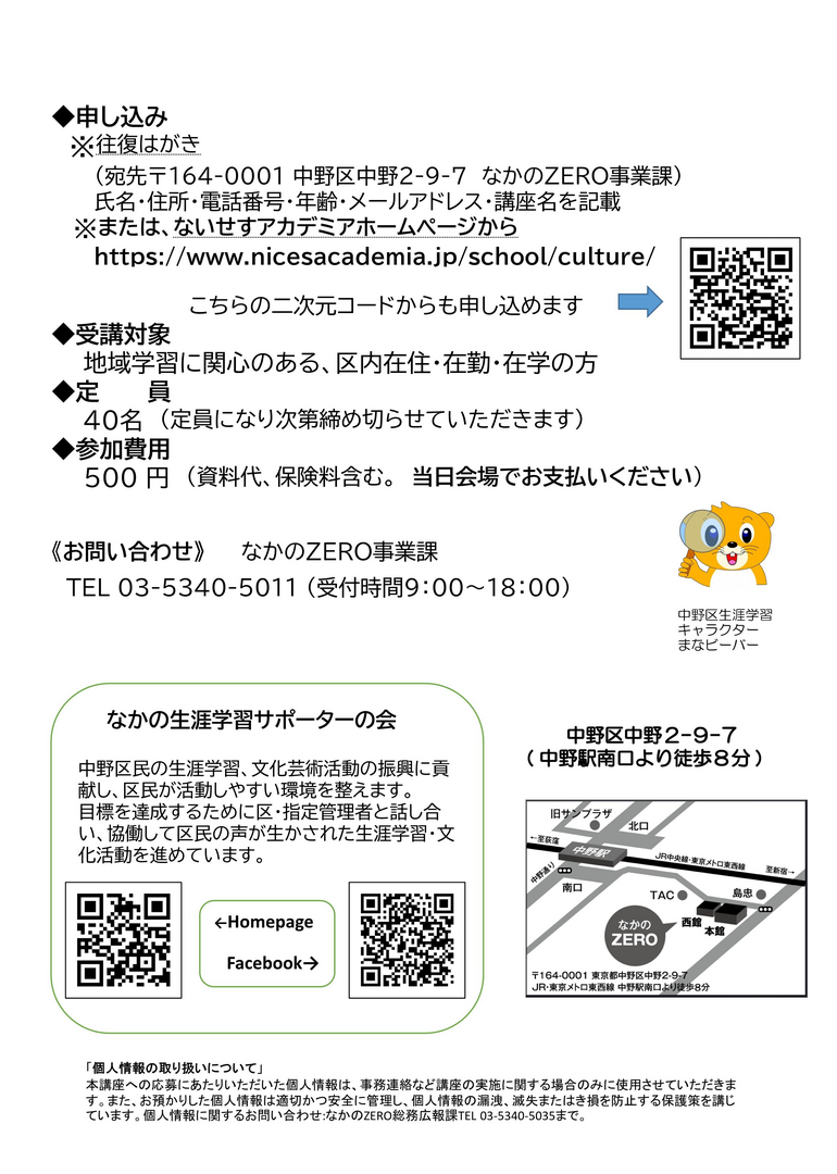開催日:10月10日~2月20日 約6回 14:00~16:00 会場: なかのZERO他 参加費 (保険料含む) 500円