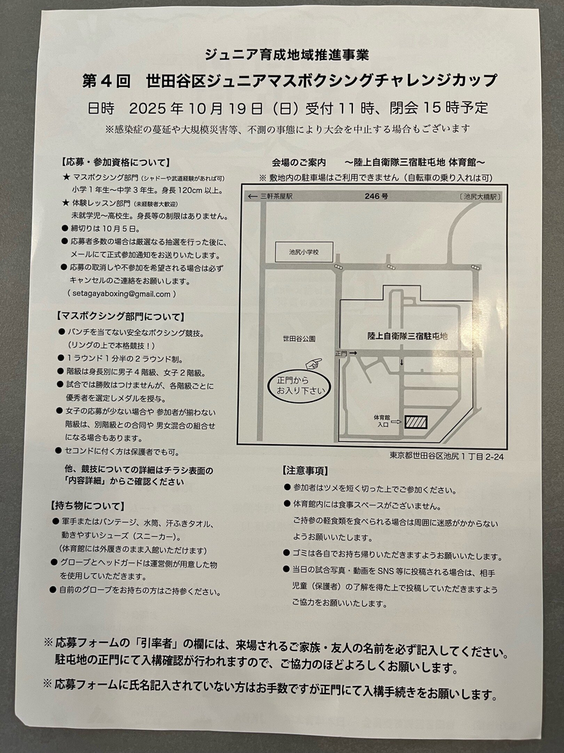 第4回世田谷区ジュニアマスボクシングチャレンジカップが開催されます。体力UP、体幹UPを目指し、パンチを当てない安全なマスボクシングを体験できます。優秀賞には金メダル、自衛隊賞には賞状が授与されます。トップ選手からの指導や自衛隊ブースでの救命処置体験もあります。