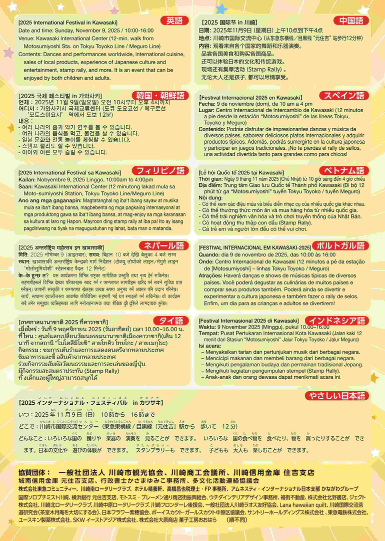 星野ルネさんトークショーを始め、さまざまな国や地域の音楽やダンスを楽しめるステージ、川崎で活動する民間団体の活動発表、外国人のための相談や情報提供、留学生と交流できるコーナー、世界の物産展、世界のキッチンカーなど盛りだくさんのイベントです。