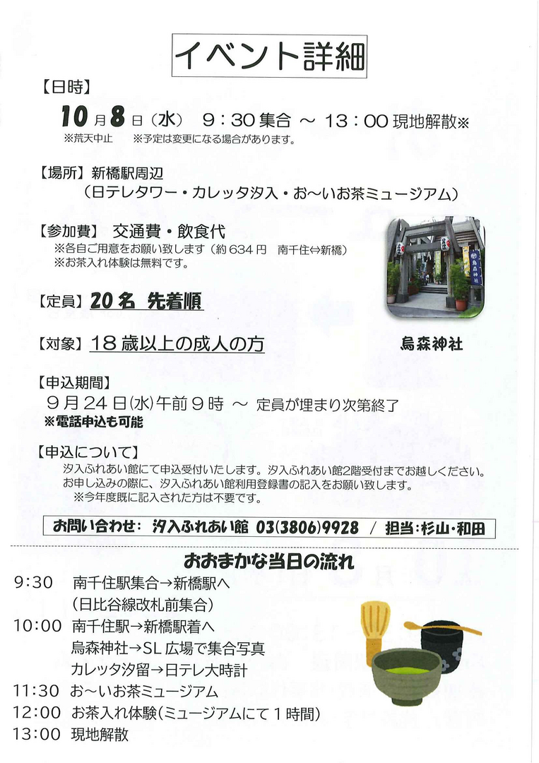 今回の大人のおでかけは新橋駅周辺を散策します。お~いお茶ミュージアムではお茶入れ体験を行います。対象は18歳以上の成人の方で、先着20名になります。参加費は交通費・食事代は各自負担です。お茶入れ体験は無料です。イベントは荒天中止で、予定は変更になる場合があります。