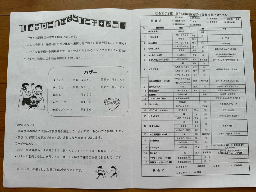 バザーは体育祭当日10月19日 (日) 10:30~13:00までです。バザーの前売り券は、9月26日 (金) 17時まで味酒公民館で販売しています。