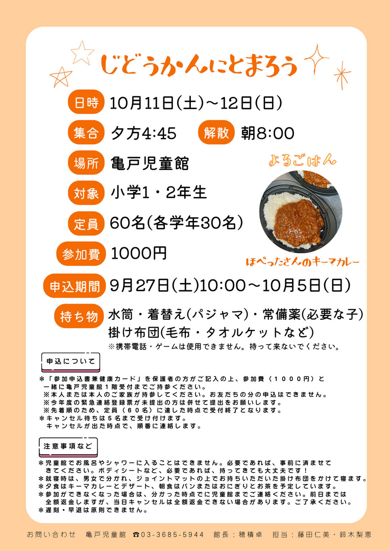1・2年生対象の宿泊イベント行います!児童館にみんなで泊まってみませんか?今回は児童館で普段行っているプログラムをメインに遊びたいと思います。先着での申込なので、早めにお申込みください。