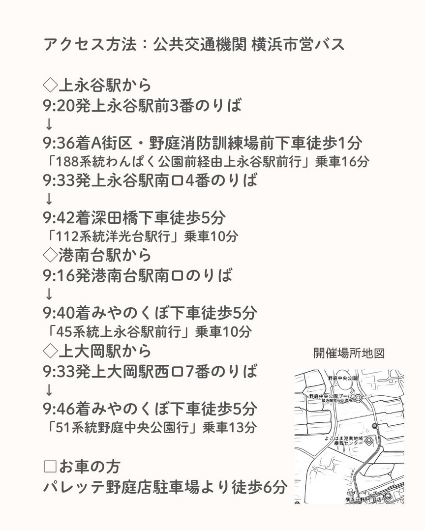 - 上永谷駅から:9:20発上永谷駅前3番のりば、9:36着A街区野庭消防訓練場前下車徒歩1分