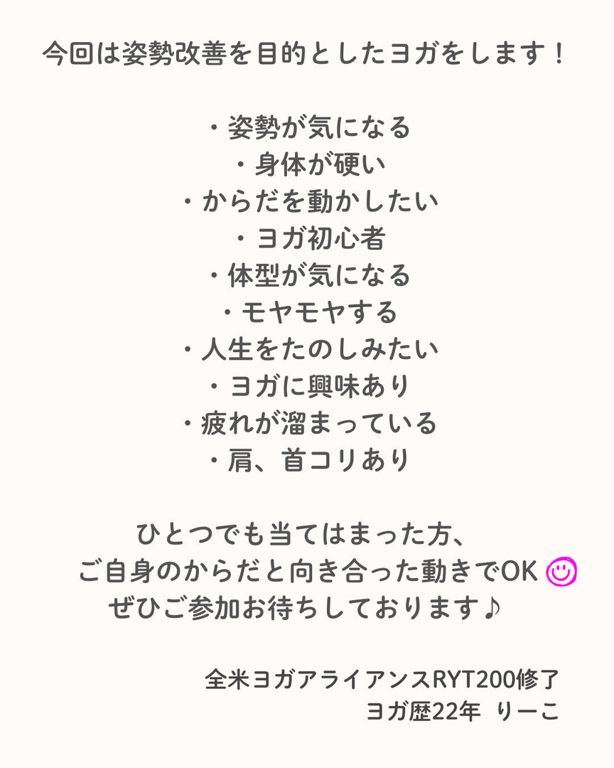 持ち物:ヨガマット、フェイスタオル、お飲み物