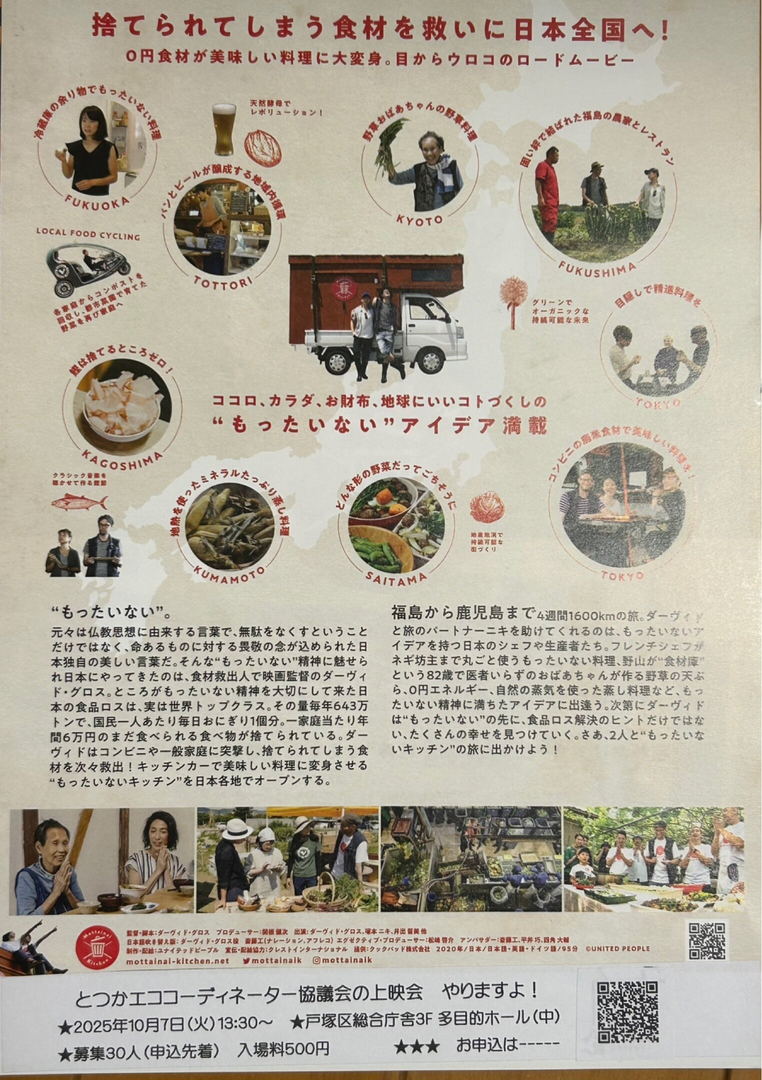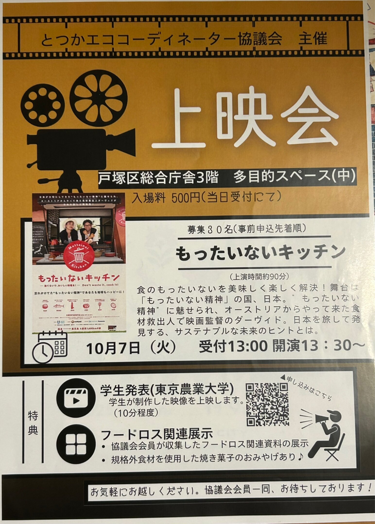 上映会は2025年10月7日(火)13:30から、戸塚区総合庁舎3階多目的スペースで行われます。入場料は500円で、募集人数は30名(事前申込先着順)です。学生発表やフードロス関連展示も行われ、規格外食材を使用した焼き菓子のおみやげもあります。