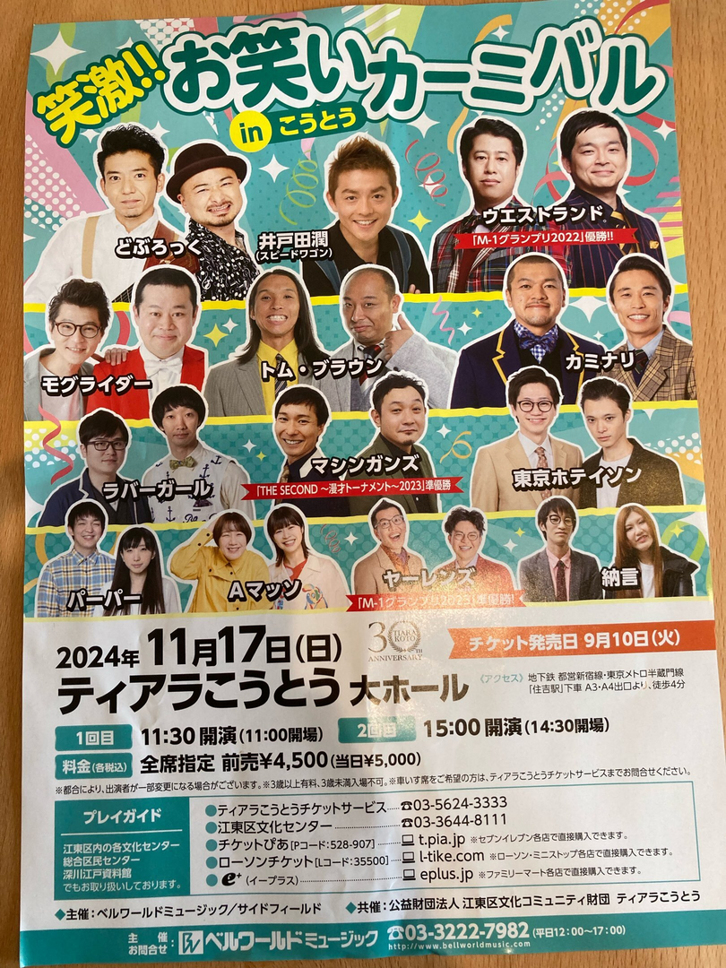 よしもとと、よしもと以外の芸人さんのネタがいろいろ楽しめるイベント⭐️ 私でも知っている豪華メンバーがたくさん出ているのに、4,500円(前売り、税込)というお得な価格設定?なのかなと思います⭐️