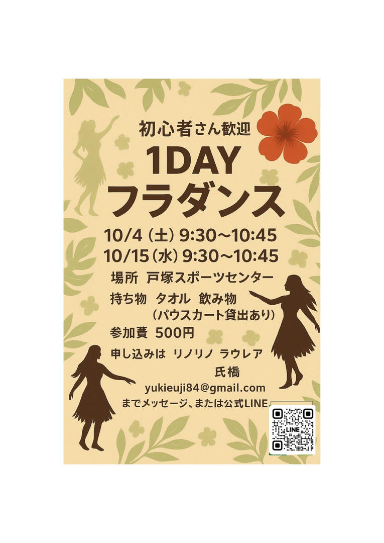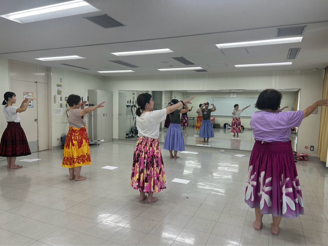 内容:フラの基本ステップから簡単な振付まで、初めての方でも楽しく体験できます。