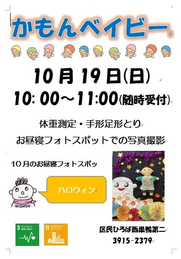 区民ひろば西巣鴨第二で『かもんベイビー』を開催します。10月のお昼寝フォトスポットは「ハロウィン」です。思い出に残る写真を撮影しませんか?体重測定や手形もとります。