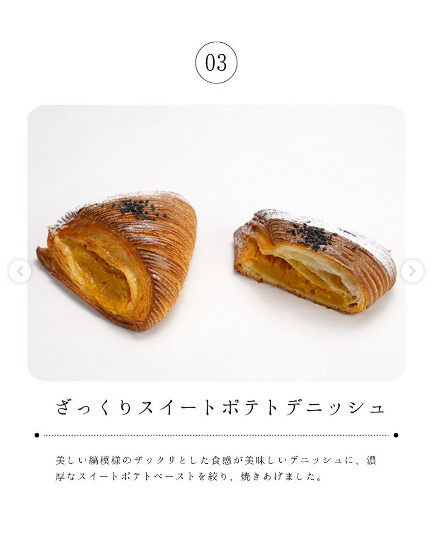 美しい縞模様のザックリとした食感が美味しいデニッシュに、濃厚なスイートポテトペーストを絞り、焼きあげました。