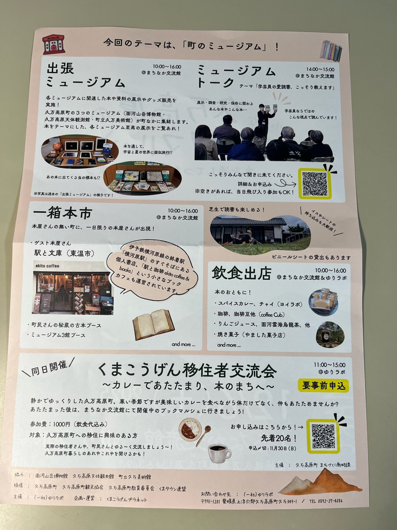 久万高原町のまちはか交流館・ゆりラボで、「久万高原の小さなブックマルシェ」を開催します。テーマは「町のミュージアム」。久万高原町の3つのミュージアム(面河山岳博物館・久万高原天体観測館・町立久万美術館)が町なかに集結します。スパイスカレー・チャイ・珈琲・焼き菓子なども出店されます。