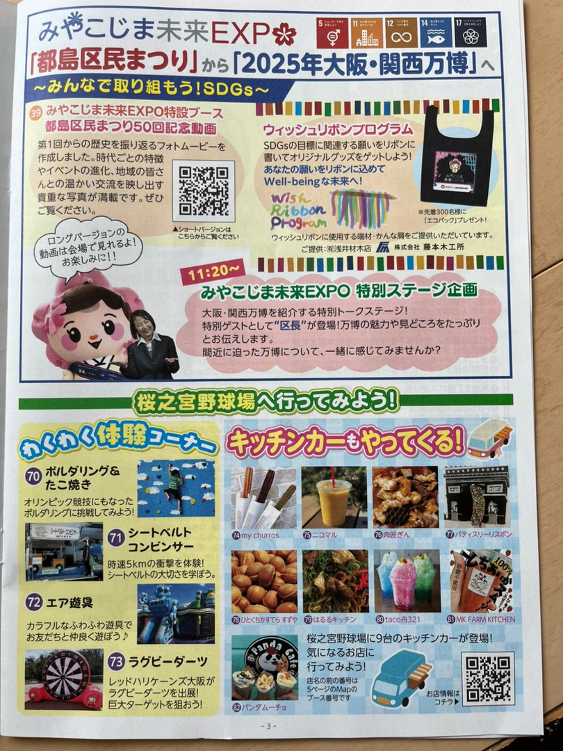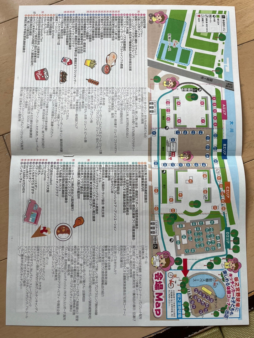 毎年、無料イベントがたくさんあって端から端までみまわると、あっという間に1日がすぎます。注意事項として、自転車を置いたら置き場所を景色と共に撮ること、敷物必須、マイバッグは大きめで、早めに行くのが歩きやすくておすすめです。会場は広く、雨天後はぬかるみがあること、Bエリアのご飯系は安くて早めに売り切れること、Dエリアは保育士さんもいる子供向けで先に行くと離れてくれないこと、A.Cエリアも子供向けで面白いこと、自転車横のキッチンカーは比較的すいていること、無料のイベントが多いこと、自転車置き場にはバッタがたくさんいるので虫取りするのもありです。詳細は専用HPを参考にしてください。開催日の変更も確認できます。