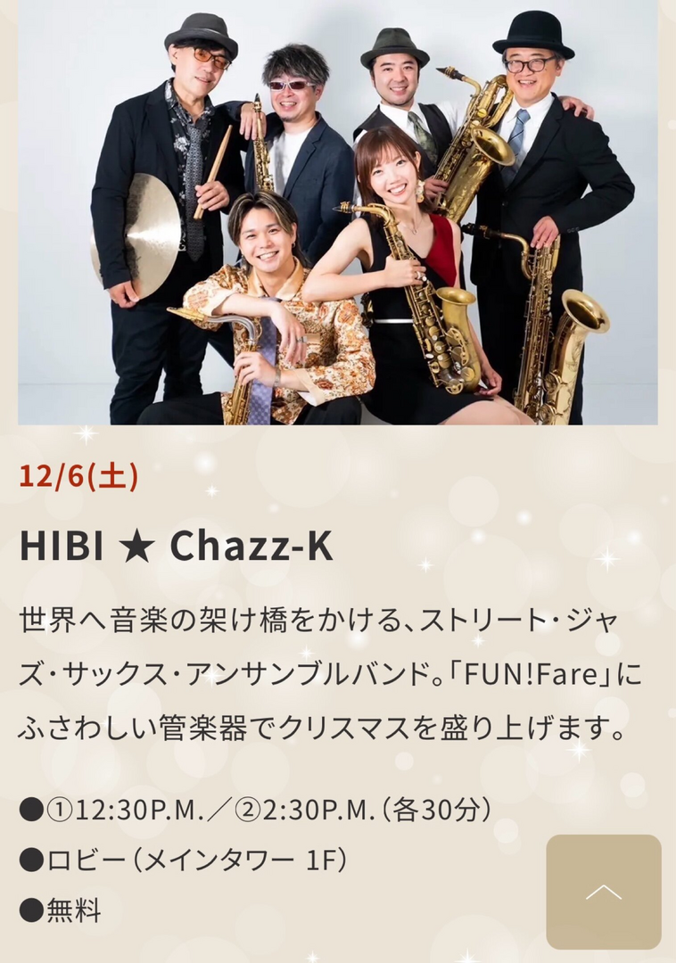 HIBI *Chazz-K(ヒビ・チャズケ)は、2014年第56回日本レコード大賞で企画賞を受賞した楽しい明るいバンドです。童謡からジャズ、歌謡曲まで幅広く演奏します。12月6日(土)に「Christmas FUN!Fare」と題して、ストリート・ジャズ・サックス・アンサンブルバンドがクリスマスを盛り上げます。演奏時間は①12:30〜13:00、②14:30〜15:00の2回です。参加は無料です。