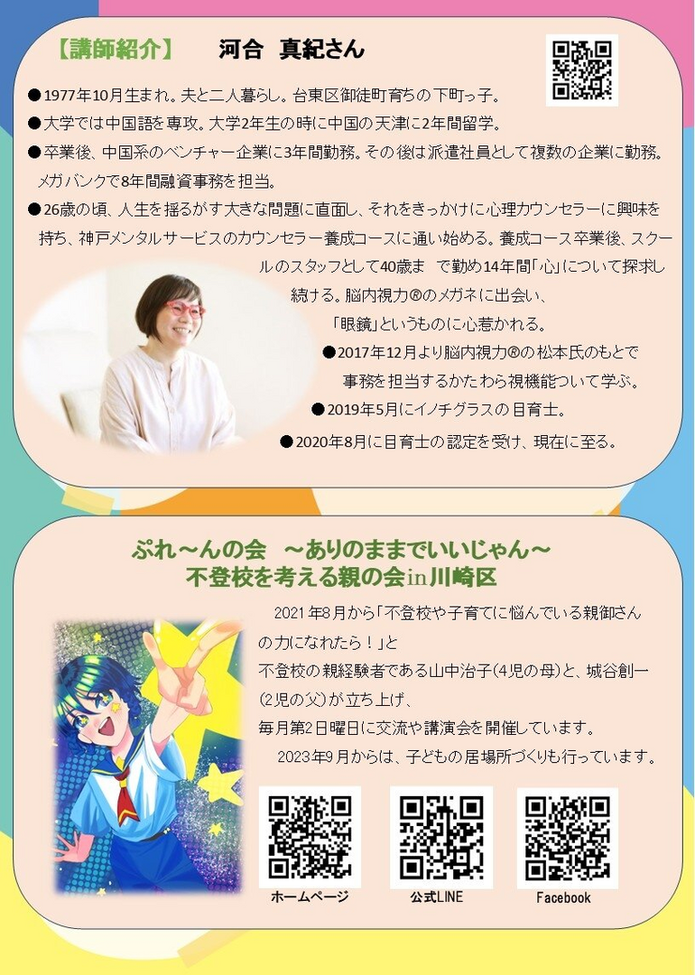 2021年8月から「不登校や子育てに悩んでいる親御さんの力になれたら!」と不登校の親経験者である山中治子 (4児の母)と、城谷創一 (2児の父)が立ち上げ、毎月第2日曜日に交流や講演会を開催しています。2023年9月からは、子どもの居場所づくりも行っています。