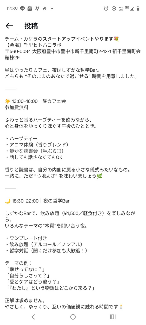 こんにちは!この度、チームカケラというグループで初イベントを開催することになりました。だれでもどんな人でもほっとできる居場所を作りたい。そんな想いをもったグループです!