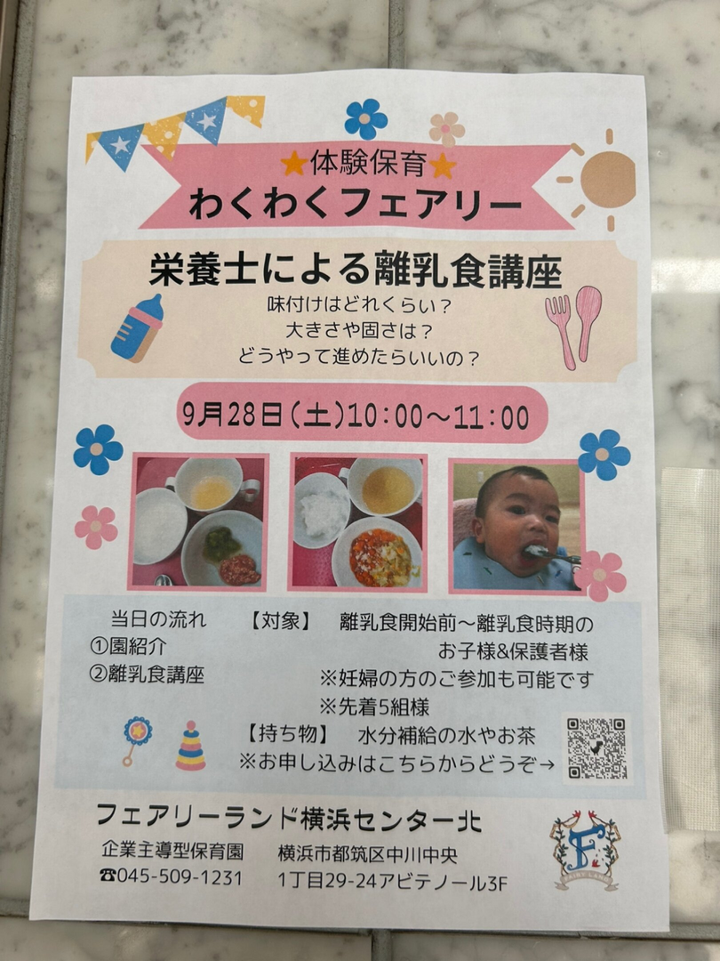 センター北駅 徒歩2分のところにある保育園、フェアリーランド横浜センター北で栄養士さんによる離乳食講座が行われます。