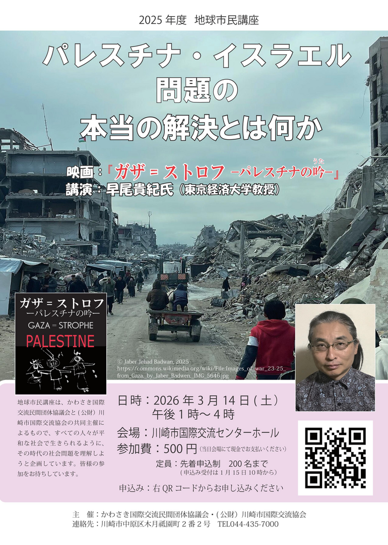 地球市民講座は、かわさき国際交流民間団体協議会と(公財)川崎市国際交流協会の共同主催によるもので、すべての人々が平和な社会で生きられるように、その時代の社会問題を理解しようと企画しています。皆様の参加をお待ちしています。