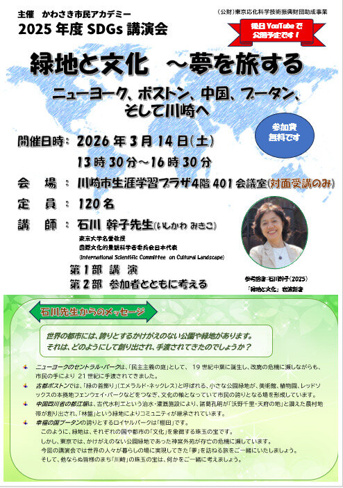 世界の都市には、誇りとするかけがえのない公園や緑地があります。それは、どのようにして創り出され、手渡されてきたのでしょうか?ニューヨークのセントラル・パークは、「民主主義の庭」として、19世紀中葉に誕生し、 改廃の危機に瀕しながらも、市民の手により 21世紀に手渡されてきました。古都ボストンでは、「緑の首飾り」(エメラルド・ネックレス) と呼ばれる、 小さな公園緑地が、美術館、植物園、 レッドソックスの本拠地フェンウェイパークなどをつなぎ、文化の軸となっていて市民の誇りとなる場を形成しています。古代水利工という治水・灌漑施設により、諸葛孔明が「沃野千里・天府の地」と讃えた農村地+ 中国四川省の都江帯が創り出され、 「林」という緑地によりコミュニティが継承されています。幸福の国ブータンの誇りとするロイヤルパークは「棚田」です。このように、緑地は、それぞれの国や都市の「文化」を象徴する珠玉の宝です。しかし、東京では、かけがえのない公園緑地であった神宮外苑が存亡の危機に瀕しています。今回の講演会では世界の人々が暮らしの場に実現してきた 「夢」を訪ねる旅をご一緒にいたしましょう。そして、他ならぬ皆様のまち 「川崎」の珠玉の宝は、何かをご一緒に考えましょう。