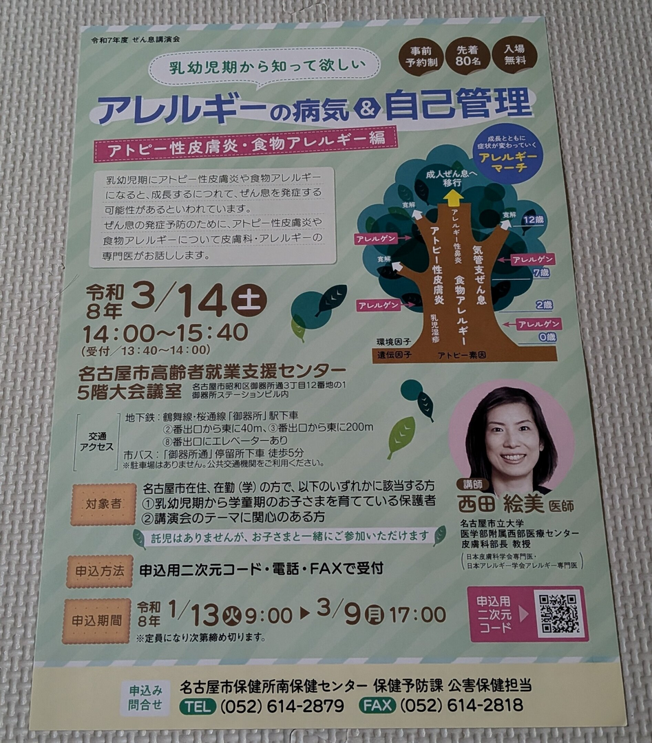 アトピー性皮膚炎や食物アレルギーについて専門家の先生から話を聞ける講演会が開催されます。入場無料で事前予約制(先着80名)です。託児はありませんが、お子さまと一緒に参加可能です!