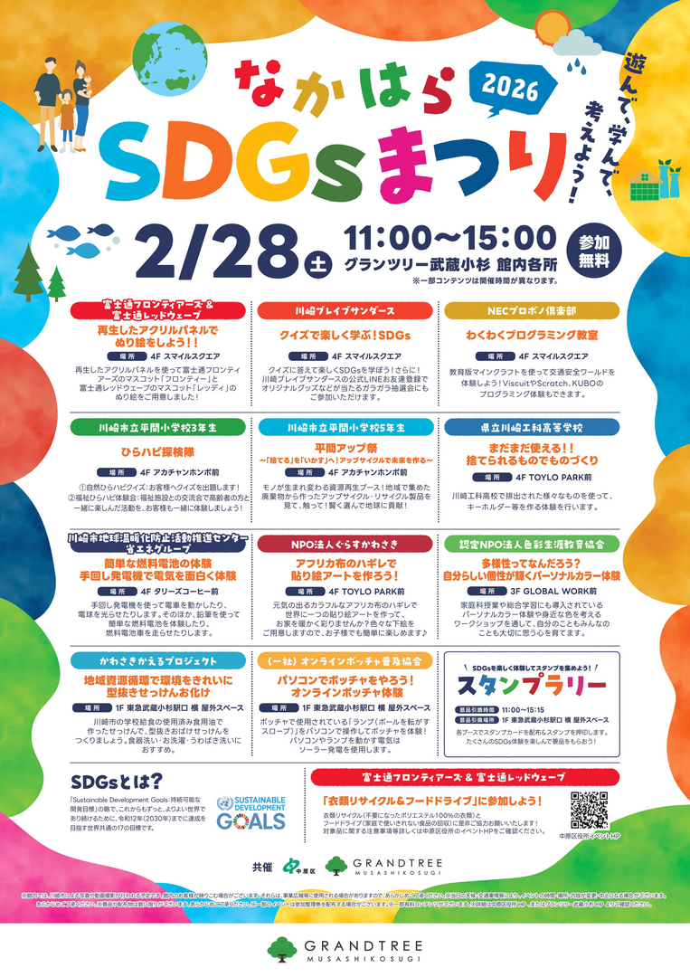 なかはらSDGsまつり2026が2月28日(土)に開催されます。川崎SDGsパートナーや区内の学校、川崎スポーツパートナーなどが参加し、ワークショップやプログラミング、SDGsを楽しく学べるブースが出展されます。