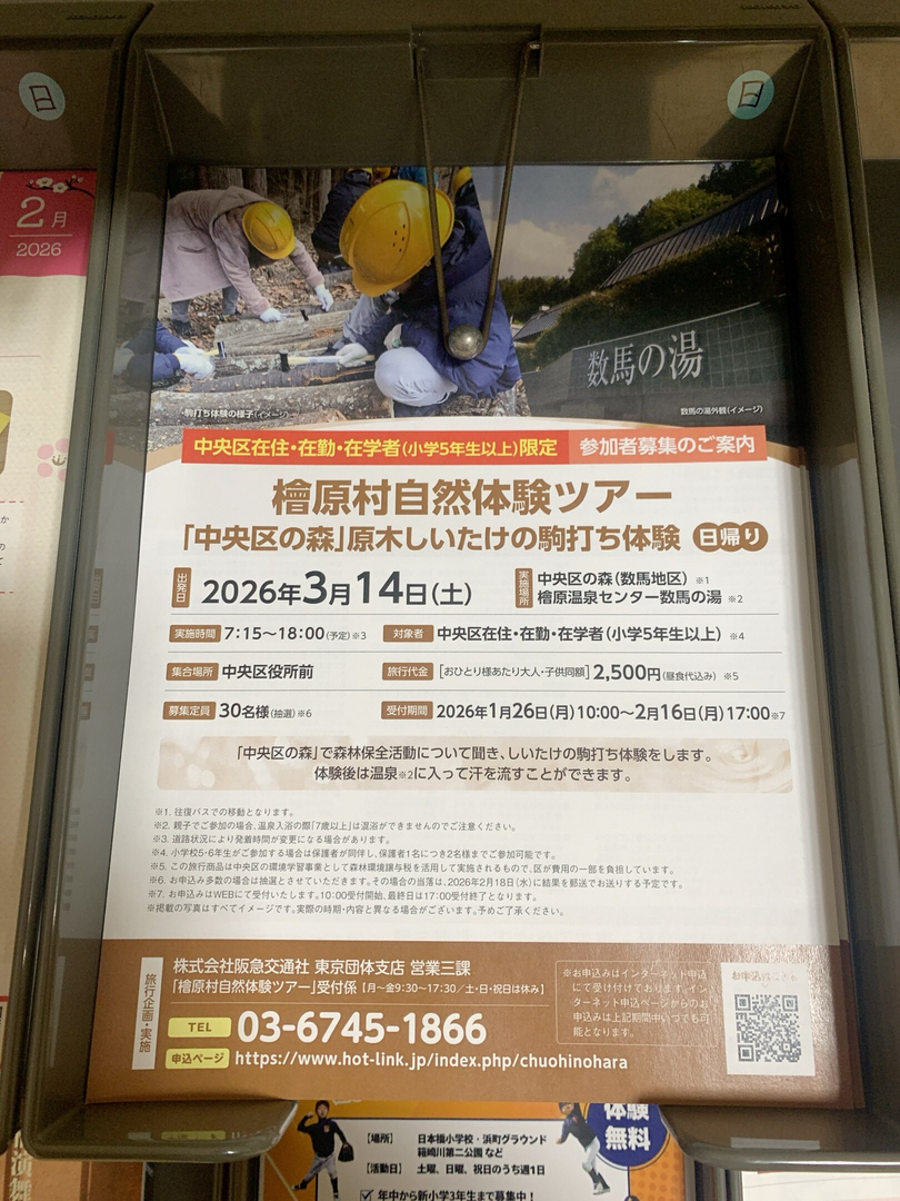 「中央区の森」で森林保全活動について聞き、しいたけの駒打ち体験をします。体験後は温泉に入って汗を流すことができます。往復バスでの移動となります。親子でご参加の場合、温泉入浴の際「7歳以上」は混浴ができませんのでご注意ください。道路状況により発着時間が変更になる場合があります。小学校5・6年生がご参加する場合は保護者が同伴し、保護者1名につき2名様までご参加可能です。この旅行商品は中央区の環境学習事業として森林環境譲与税を活用して実施されるもので、区が費用の一部を負担しています。お申込み多数の場合は抽選とさせていただきます。その場合の当落は、2026年2月18日(水)に結果を郵送でお送りする予定です。お申込みはWEBにて受付いたします。10:00受付開始 最終日は17:00 受付終了となります。