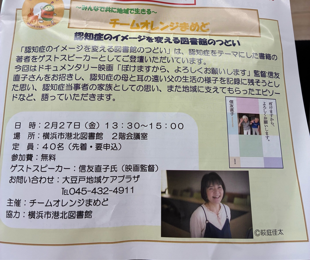 今回はドキュメンタリー映画「ぼけますから、よろしくお願いします」監督備友直子さんをお招きし、認知症の母と耳の遠い父の生活の様子を記録に残そうとした思い、認知症当事者の家族としての思い、また地域に支えてもらったエピソードなど、語っていただきます。