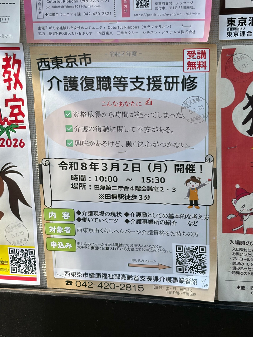 西東京市で開催される介護復職等支援研修です。受講は無料です。