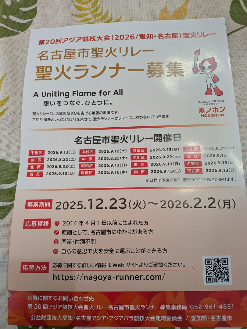 アジア競技大会の名古屋市聖火リレーの聖火ランナーを募集中です✨️
