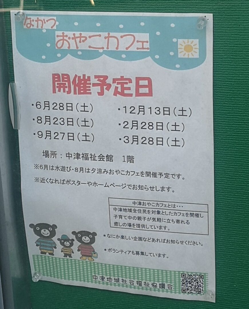 おやこカフェは、子育て中の親子が気軽に立ち寄れる癒しの場を提供するカフェです。中津地域全住民を対象としており、様々な楽しい企画を予定しています。ボランティアも募集しています。