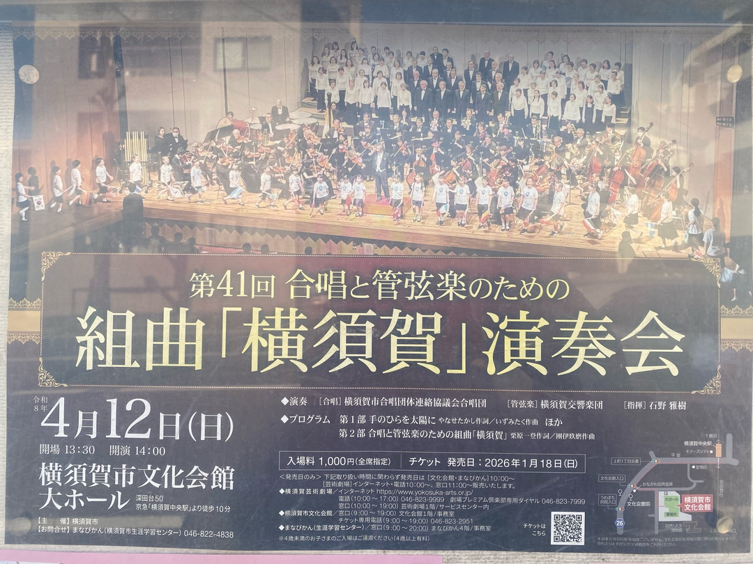 横須賀市文化会館大ホールで開催される演奏会です。第一部では「手のひらを太陽に」などが演奏され、第二部では合唱と管弦楽のための組曲「横須賀」が披露されます。演奏は横須賀市合唱団体連絡協議会合唱団と横須賀交響楽団が担当し、指揮は石野雅樹氏が務めます。入場料は全席指定で1,000円です。チケットは2026年1月18日から販売されます。