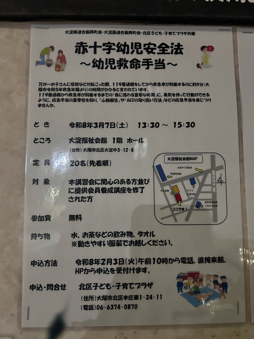 万が一お子さんに怪我などが起こった際、119番通報をしてから救急車が到着するのに約9分(大阪市令和5年急年報より)の時間がかかると言われています。119番通報から救急車が到着するまでの「命に係わる重要な時間」に、勇気を持って行動ができるように、応急手当の重要性を知り、「心肺蘇生」や「AEDの取り扱い方法」などの応急手当を身につけませんか。