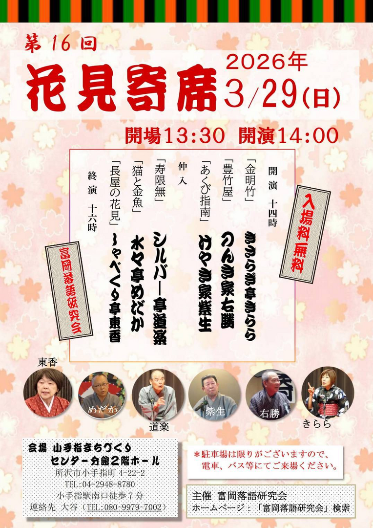 第16回花見寄席は、2026年3月29日(日)に行われます。開場は13:30、開演は14:00です。入場料は無料です。
