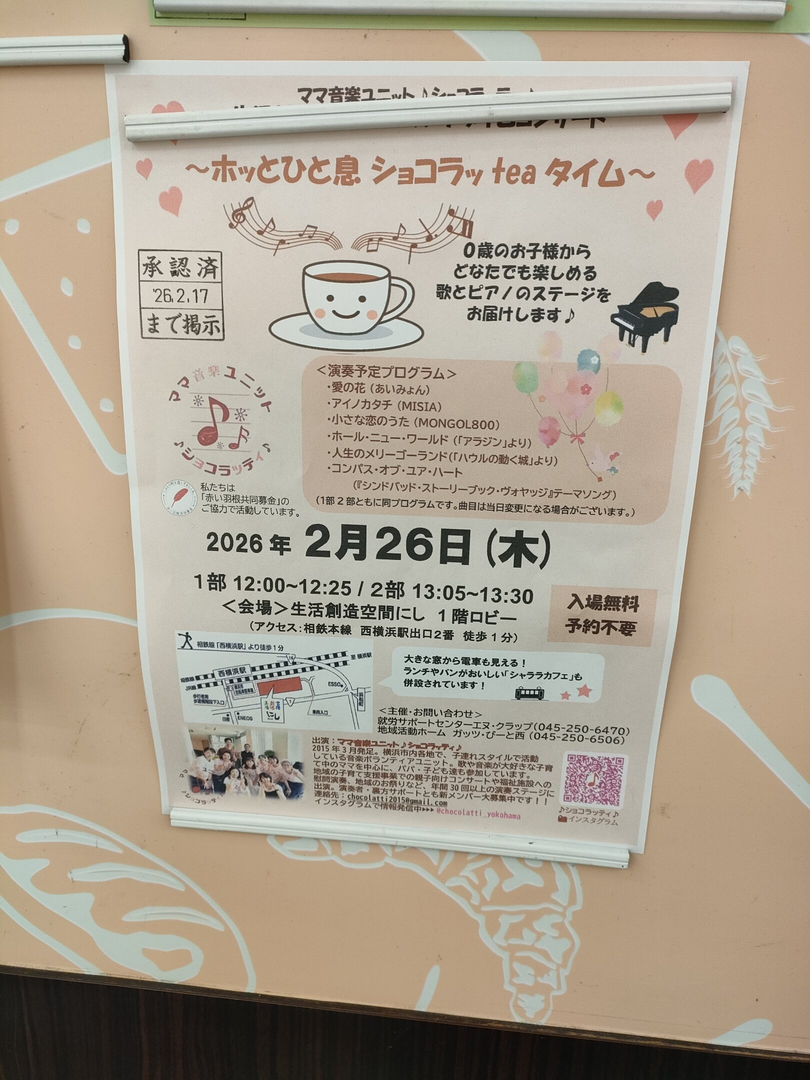 生活創造空間にしにて、ホッとひと息ショコラッteaタイムが開催予定です。入場無料、予約不要で0歳のお子様からどなたでも楽しめる歌とピアノのステージです。第一部、第二部ともに20分程度なので、小さなお子様でも退屈せずに過ごせます。会場は相鉄線西横浜駅からすぐで、電車好きのお子様がよく電車を見に来ています。