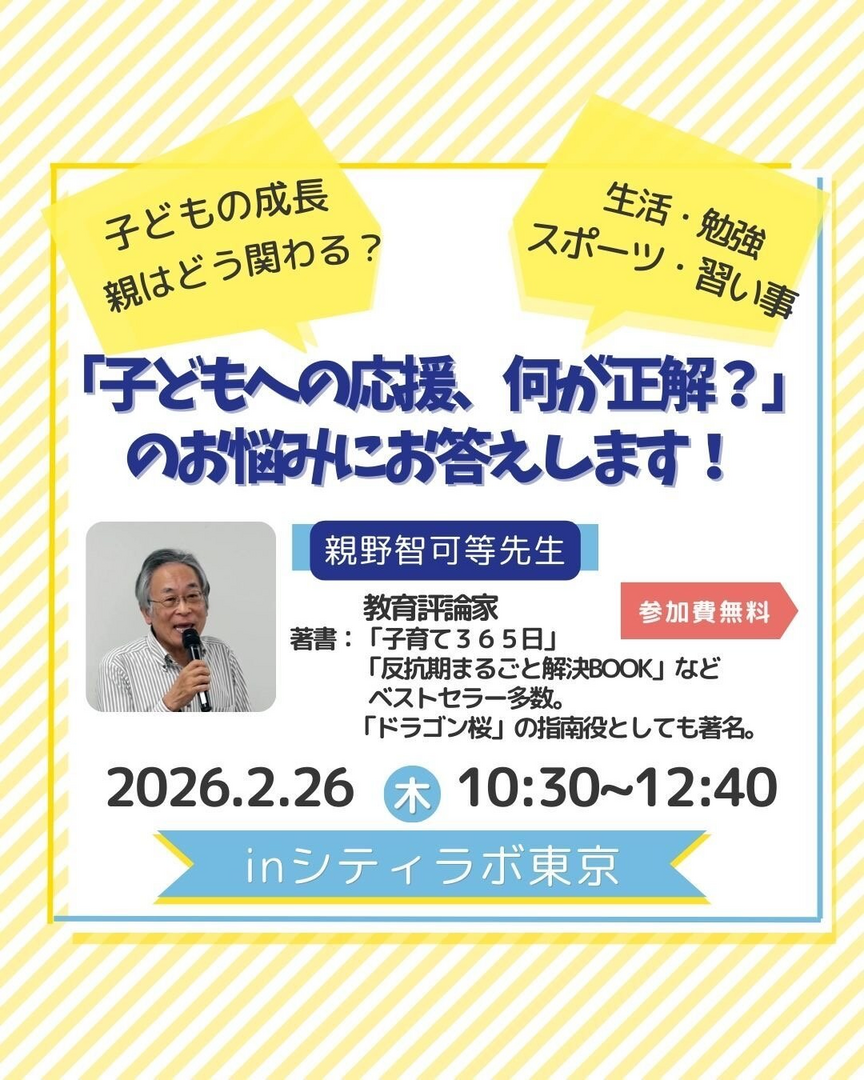 全家研ポピーと、全国のママコミュニティをつなぐ「ママノユメ」が協力し、教育評論家・親野智可等先生をお迎えして、親子の関わり方を一緒に考える《子育て相談おはなし会》を開催します。