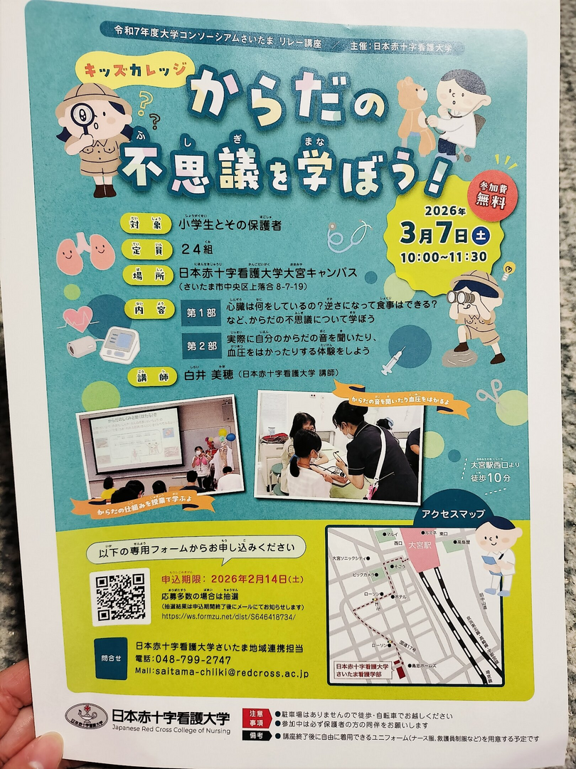 小学生とその保護者を対象に、日本赤十字看護大学の講師による学びのイベントです。心臓の働きや、逆さになって食事ができるかなど、からだの不思議について学びます。また、自分のからだの音を聞いたり、血圧を測ったりする体験も行います。