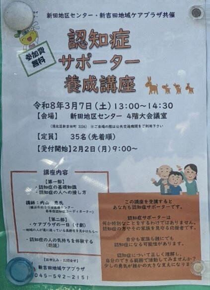 新田地区センター・新吉田地域ケアブラザ共催の認知症サポーター養成講座が開催されます。この講座を受講すると、あなたも認知症サポーターとして活動できます。認知症サポーターは、認知症の方やその家族を見守る応援者です。認知症について正しく理解し、自分のできる範囲で活動してみませんか?