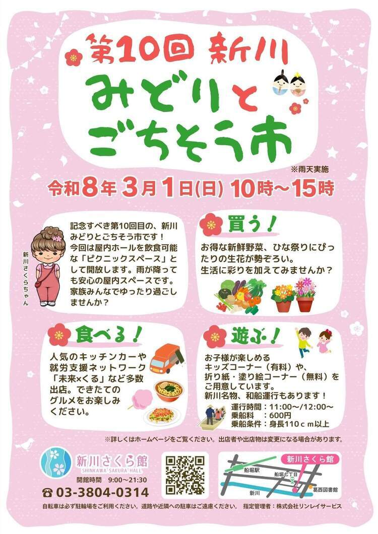 AIによるイベントの概要説明春の訪れとともに、記念すべき第10回目の「新川みどりとごちそう市」を開催します。今回は、屋内ホールを「ピクニックスペース」として開放。キッチンカーのグルメを囲んで、家族みんなでゆったり過ごしませんか。