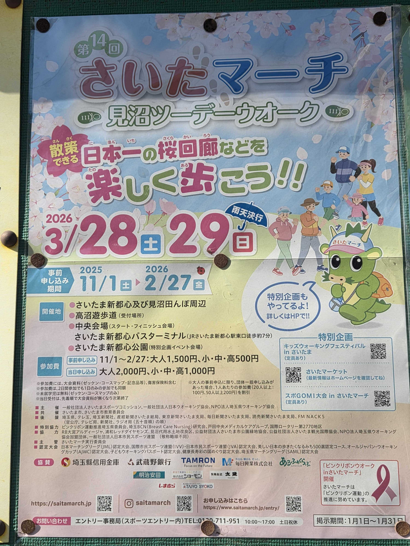 第14回さいたマーチ〜見沼ツーデーウオーク〜が開催されます。春の訪れを感じながら、見沼田んぼ周辺を楽しく歩くイベントです。開催日は2026年3月28日(土)と3月29日(日)で、雨天決行です。