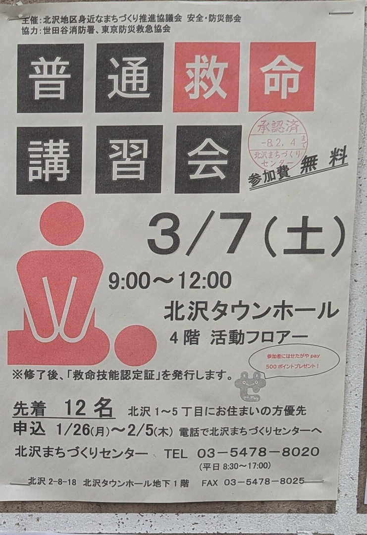 普通救命講習会が3月7日(土)9:00から12:00まで北沢タウンホール4階活動フロアーで開催されます。参加費は無料で、参加者にはせたがやpay 500ポイントがプレゼントされます。修了後には「救命技能認定証」が発行されます。北沢1~5丁目にお住まいの方が優先され、先着12名まで参加可能です。申し込みは1月26日(月)から2月5日(木)まで電話で受け付けています。主催は北沢地区身近なまちづくり推進協議会 安全防災部会で、協力は世田谷消防署と東京防災救急協会です。