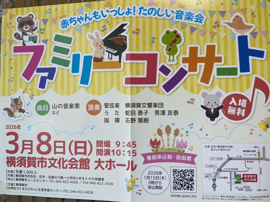 横須賀市文化会館大ホールで開催されるファミリーコンサートです。赤ちゃんも一緒に参加でき、子供たちも聞き馴染みのある歌をみんなで楽しめます。事前申し込み制で自由席、入場は無料です。