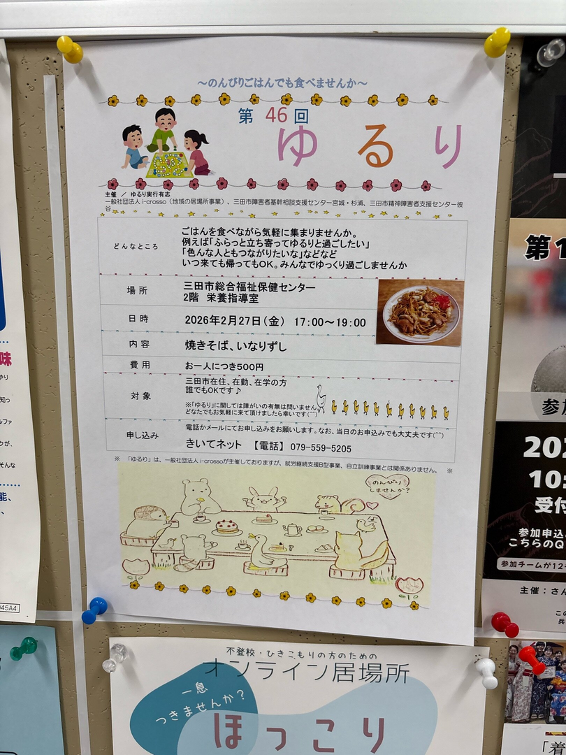 主催 / ゆるり実行有志 一般社団法人 crosso (地域の居場所事業) 三田市障害者基幹相談支援センター宮城・杉浦、 三田市精神障害者支援センター彼