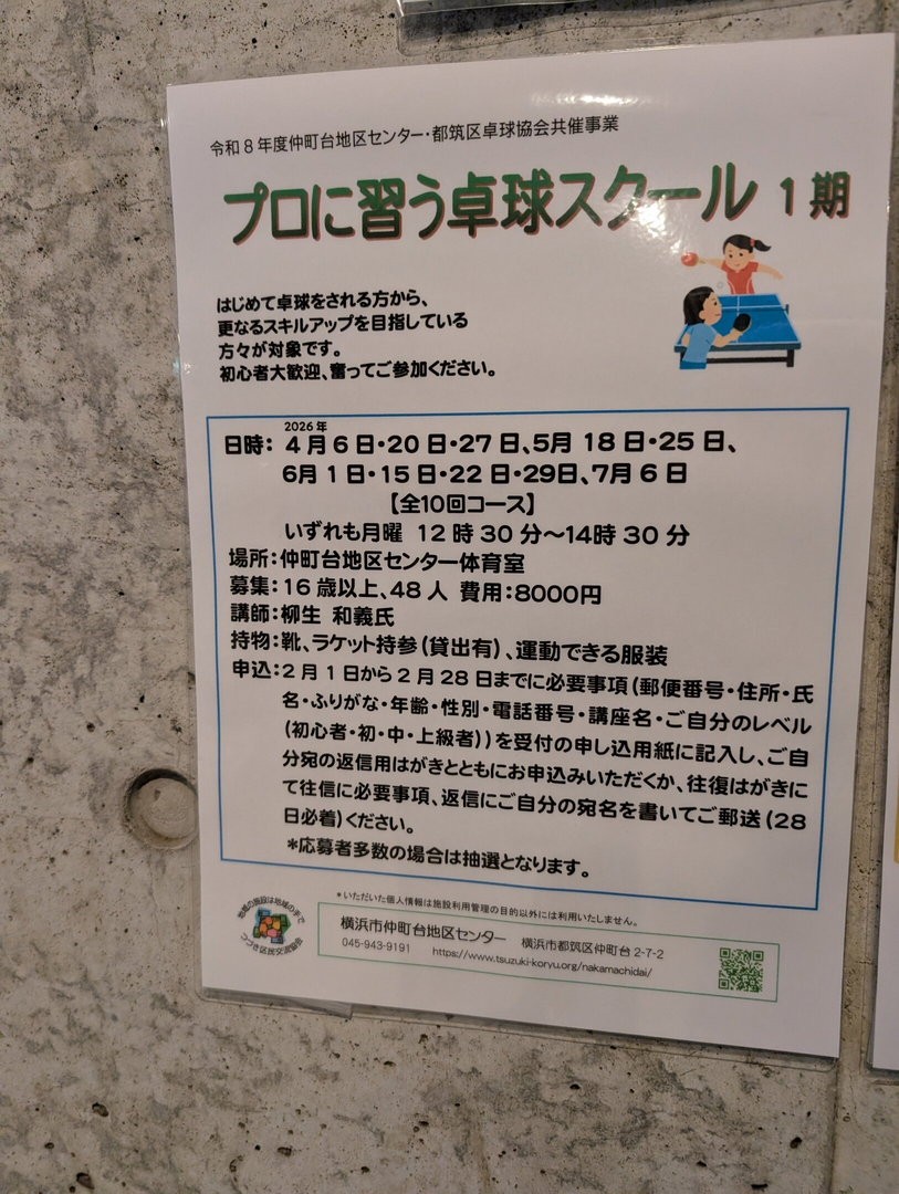 申込:2月1日から2月28日までに必要事項(郵便番号・住所・氏名・ふりがな・年齢・性別・電話番号・講座名・ご自分のレベル(初心者・初・中・上級者))を受付の申し込用紙に記入し、ご自分宛の返信用はがきとともにお申込みいただくか、往復はがきにて往信に必要事項、返信にご自分の宛名を書いてご郵送 (28日必着) ください。