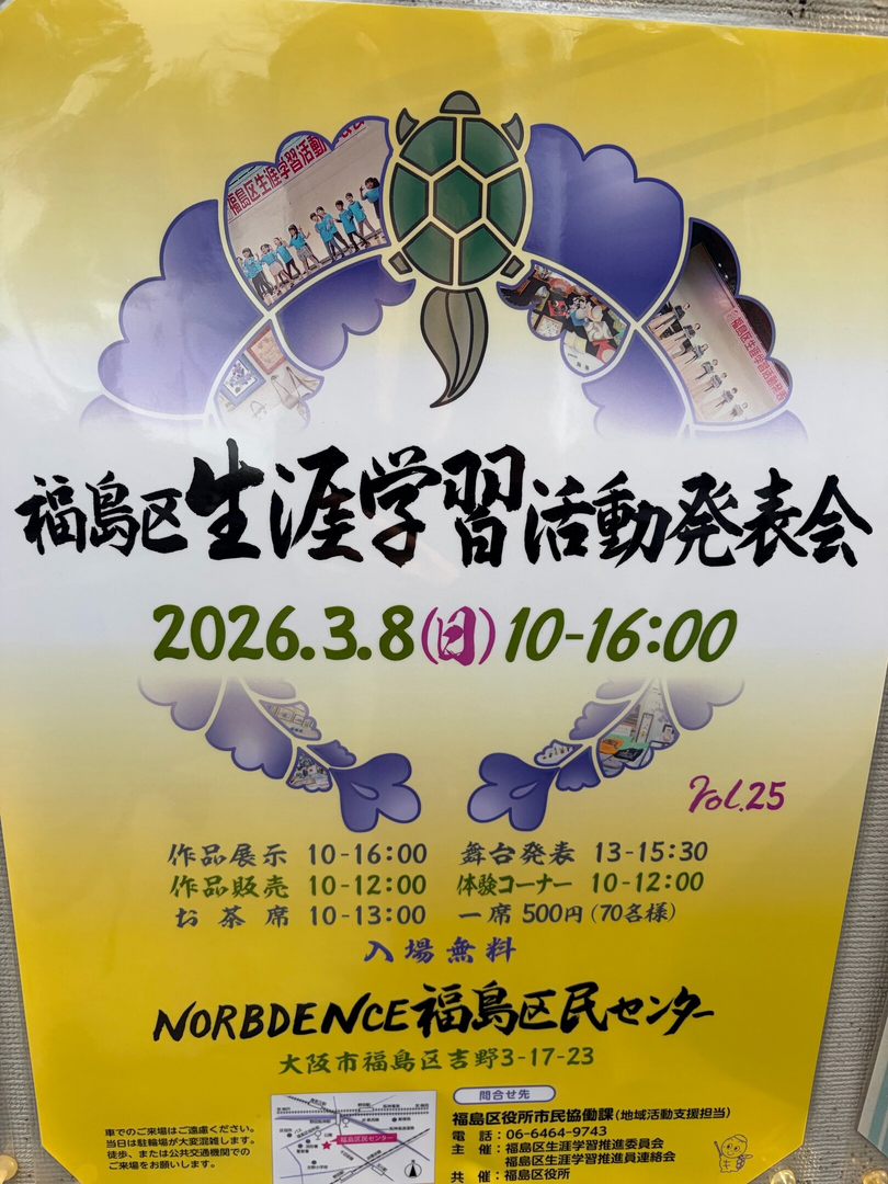 福島区生涯学習活動発表会が開催されます。作品展示、舞台発表、作品販売、体験コーナー、お茶席など多彩なプログラムが用意されています。入場は無料です。