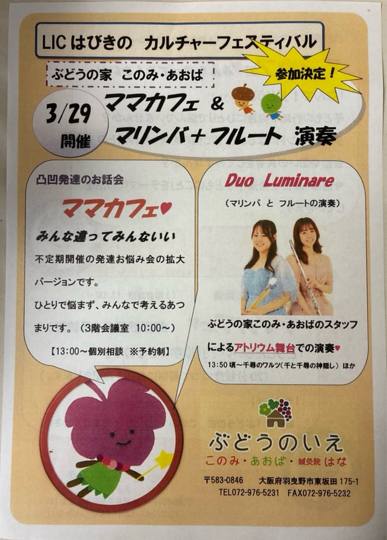 LICはびきのカルチャーフェスティバルにて、ママカフェ・みんな違ってみんないいイベントが開催されます。イベントでは、凸凹発達のお話会、マリンバとフルートの演奏、ママカフェ個別相談会が行われます。